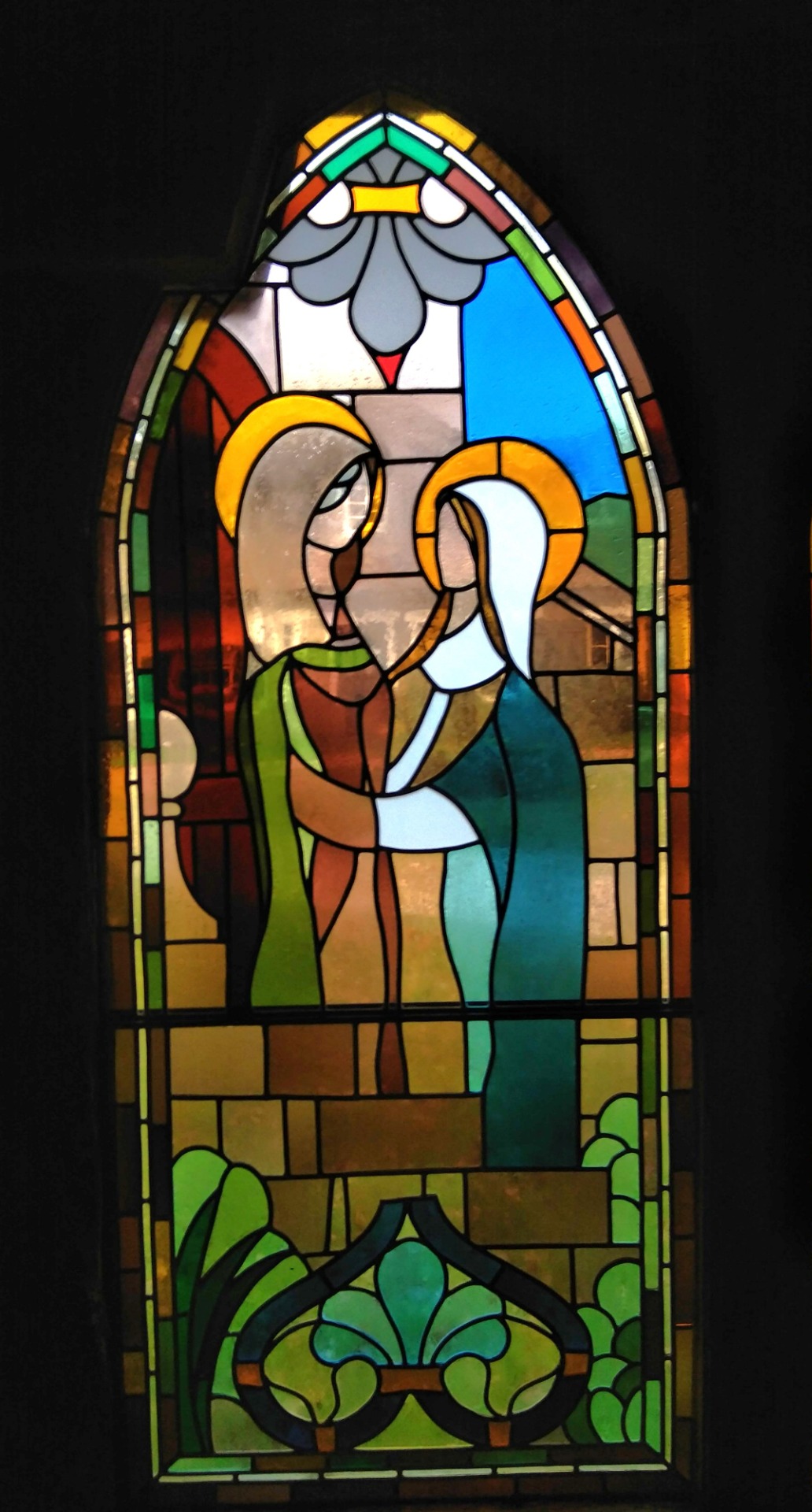 Ce vitrail met en scène la rencontre de Marie et de sa cousine Elisabeth, lorsque Marie s'est empressée d'aller voir Elisabeth dès lors que l'Ange Gabriel lui a annoncé que sa cousine et parente était enceinte et en était à son 6ème mois de grossesse.