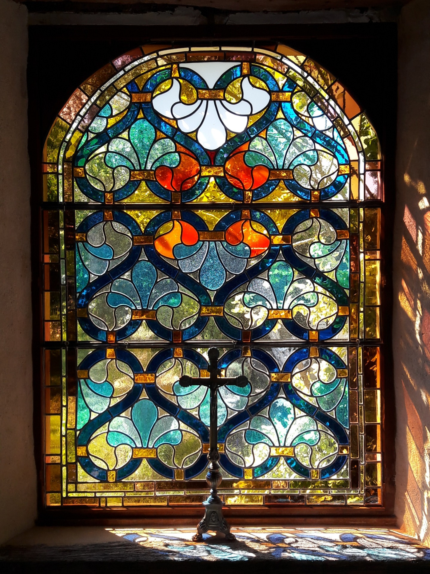 Le vitrail de l'autel montre bien comment il est possible de donner un sens spirituel à une composition. Ce vitrail en est un bon exemple.